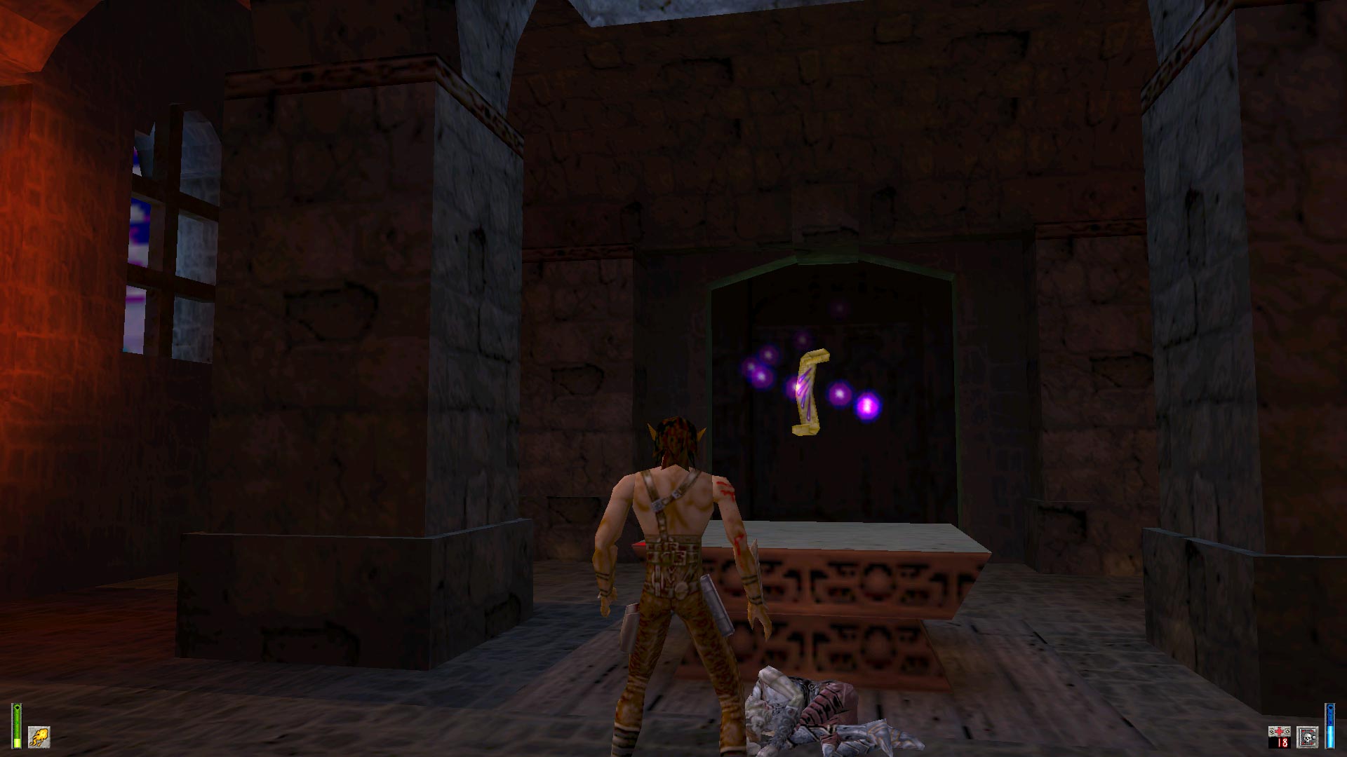 In Heretic II you play Corvus, the Elf who was exiled to the Outer Worlds but managed to find his way back home. Unfortunately, home is not the place it used to be: the land is beset by a dark magical plague and Corvus' brethren have mutated beyond recognition and have become insane with bloodlust. Enter Corvus, our hero.